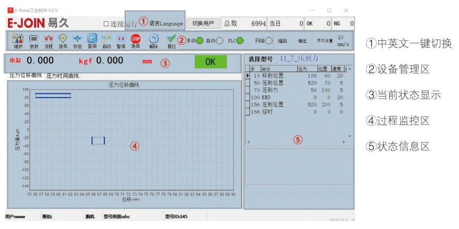 數據采集頻率20KHZ,采集精度24bit,可存儲500萬條以上壓裝曲線,E-press 工業軟件支持二次開發。